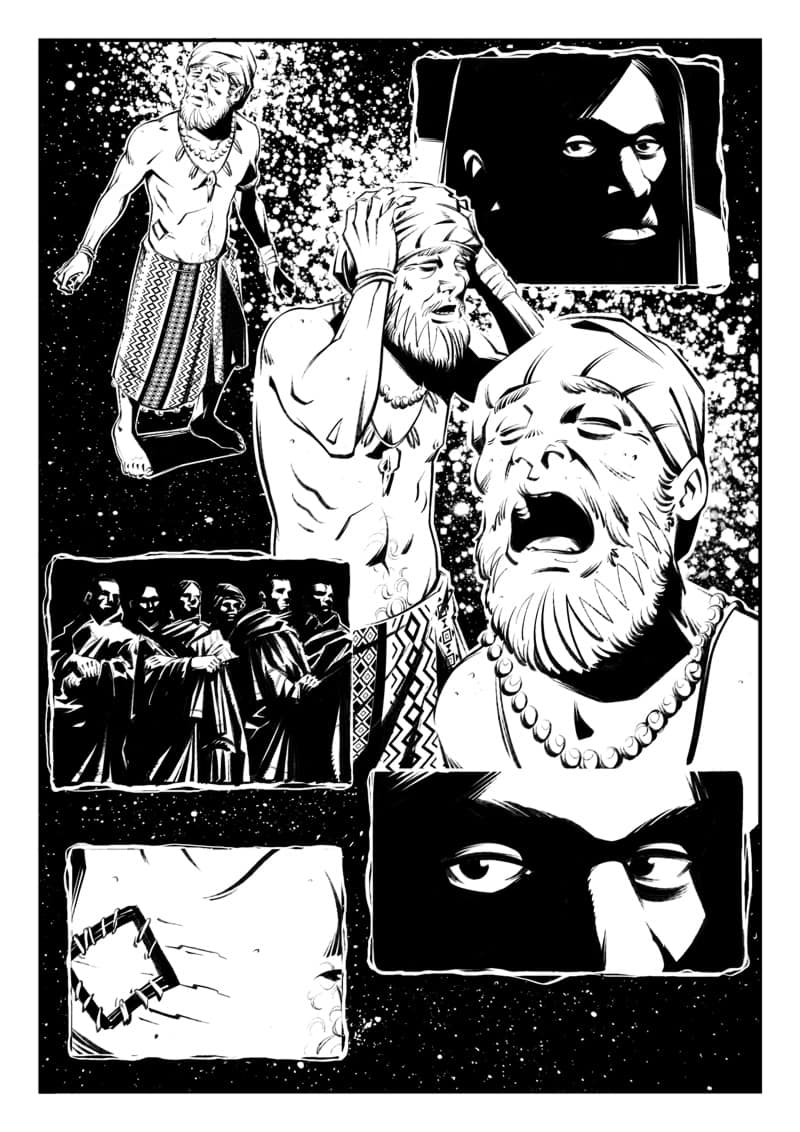 US: Grazie della domanda. Sono assolutamente indispensabili. In questa prima storia sostanzialmente i personaggi subiscono una misteriosa chiamata che li spinge a partire alla ricerca del proprio destino e che attiva alcuni loro arcani poteri connessi con la cicatrice-sigillo che recano indosso. Le loro sarebbero storie tutto sommato piuttosto indipendenti l’una rispetto all’altra, pertanto, nonostante alcuni personaggi che appaiono in più di un episodio. Le componenti narrative che hai citato cuciono insieme tutto: un misterioso personaggio sta dietro la Chiamata. Ha intessuto i propri piani. Ha una volontà imperscrutabile. Apre e chiude la vicenda. Senza prologo, interludi ed epilogo la storia praticamente non avrebbe senso compiuto. Non a caso mi sono riservato di sceneggiare io stesso apertura e chiusura e ho dato gli interludi in mano al fido Alessio, che citavo prima.
